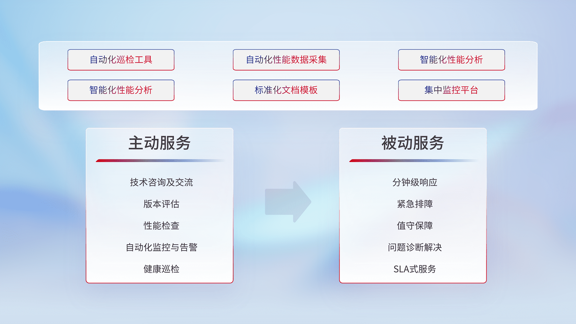 智能化工具和标准化文档,,保障服务质量,,,提供主动服务(包含技术咨询、、版本评估、、、性能检查、、、、自动化监控与告警、、、、健康巡检)和被动服务包含(分钟级响应、、、紧急排障、、、值守保障、、问题诊断解决、、、SLA服务)。。。